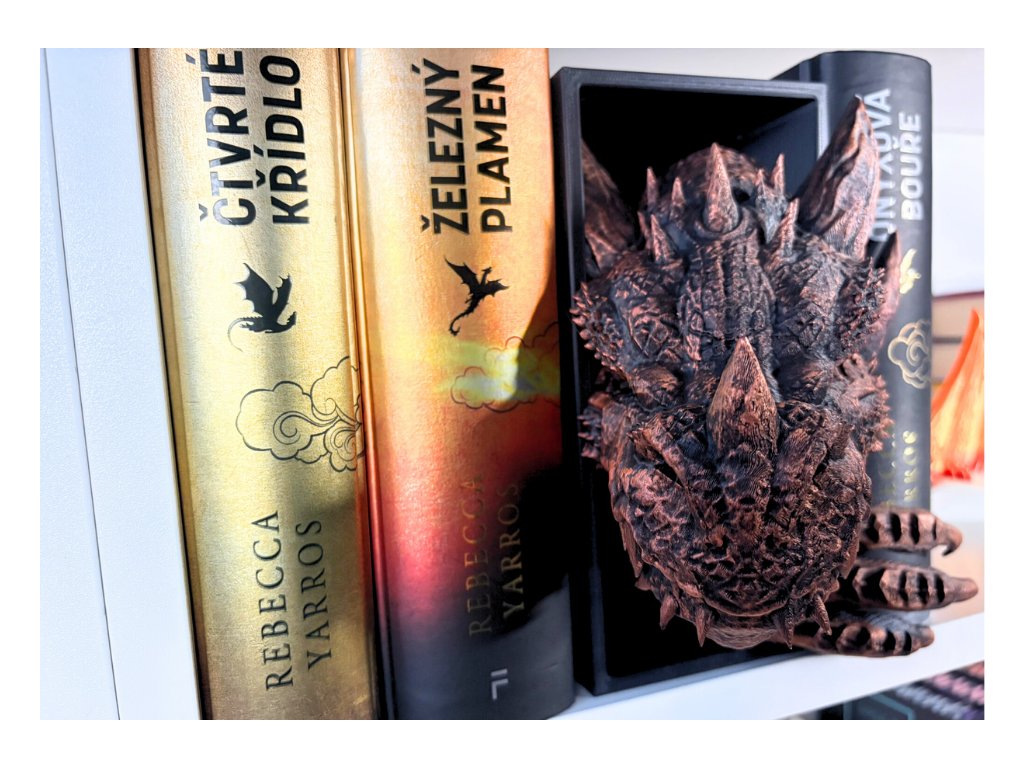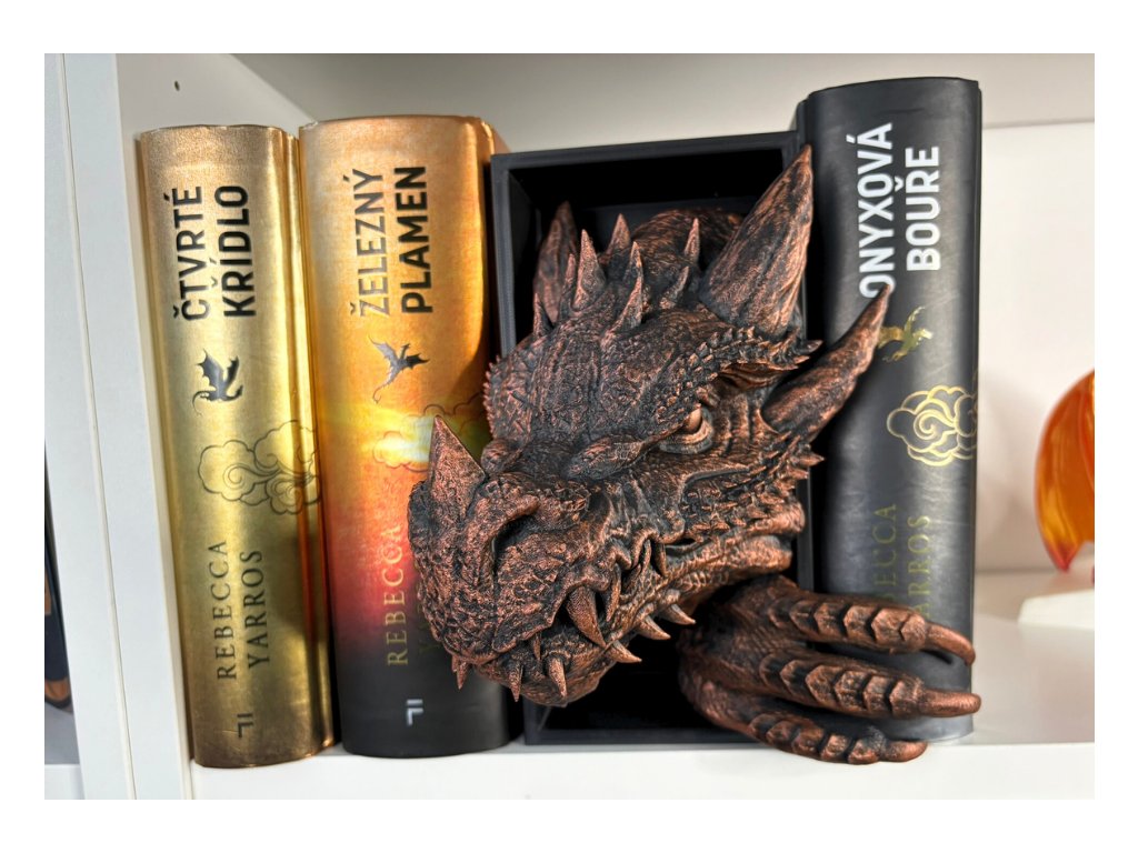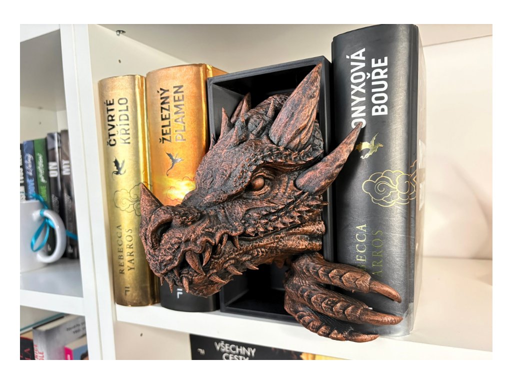 Připrav se na dechberoucí moment překvapení, kdy se mezi tvými knihami objeví dračí hlava - jakoby právě prolomila bariéru mezi fantasy světem a realitou. Tento 3D Book Nook neboli knižní zarážka, je nejen originální dekorací, ale také mistrovským 3D tištěným kouskem, který zaujme každého fanouška fantazie a příběhů.