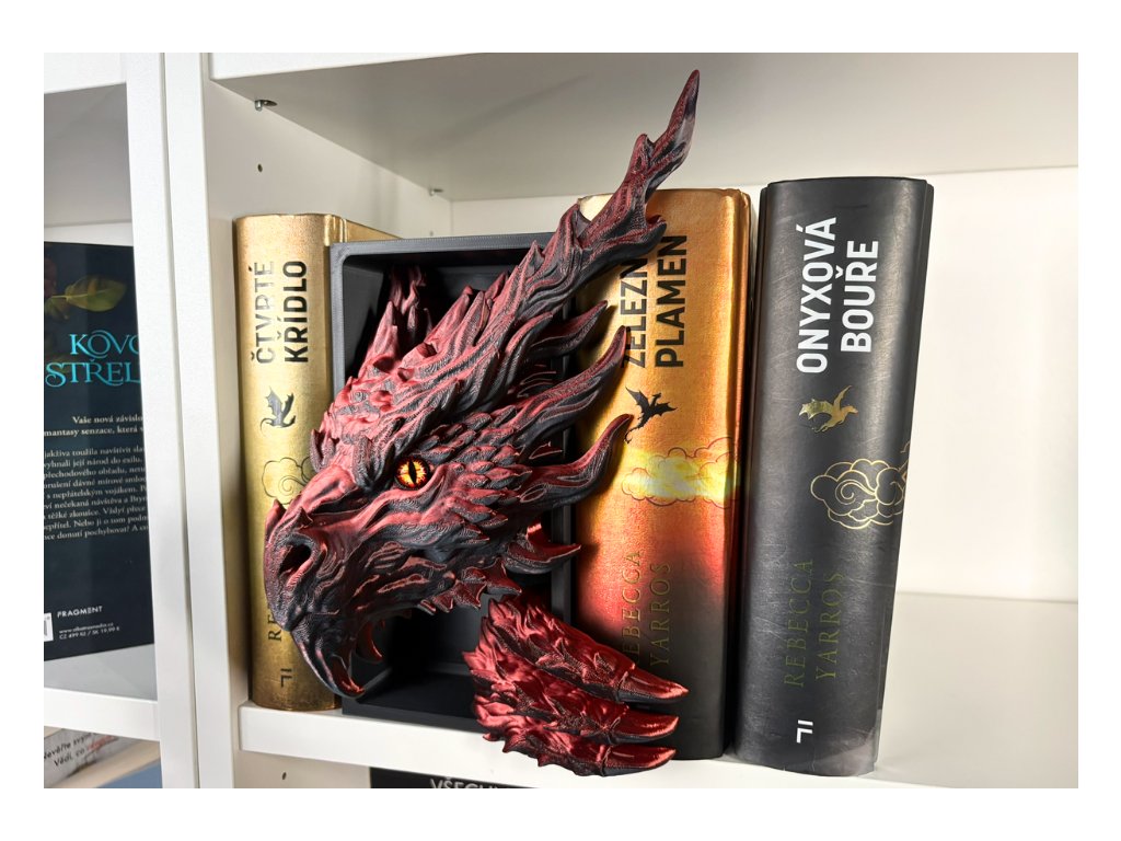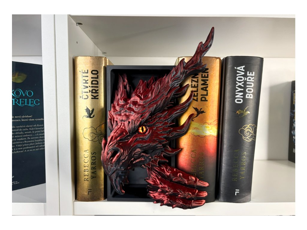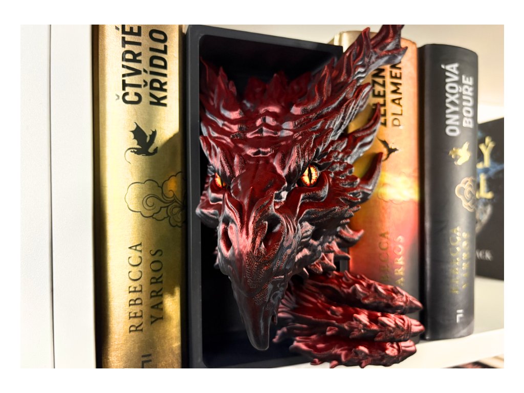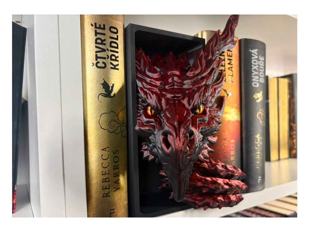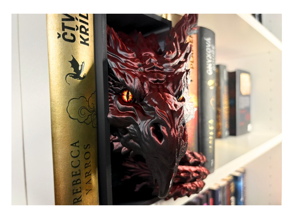 Připrav se na dechberoucí moment překvapení, kdy se mezi tvými knihami objeví dračí hlava - jakoby právě prolomila bariéru mezi fantasy světem a realitou. Tento 3D Book Nook neboli knižní zarážka, je nejen originální dekorací, ale také mistrovským 3D tištěným kouskem, který zaujme každého fanouška fantazie a příběhů.