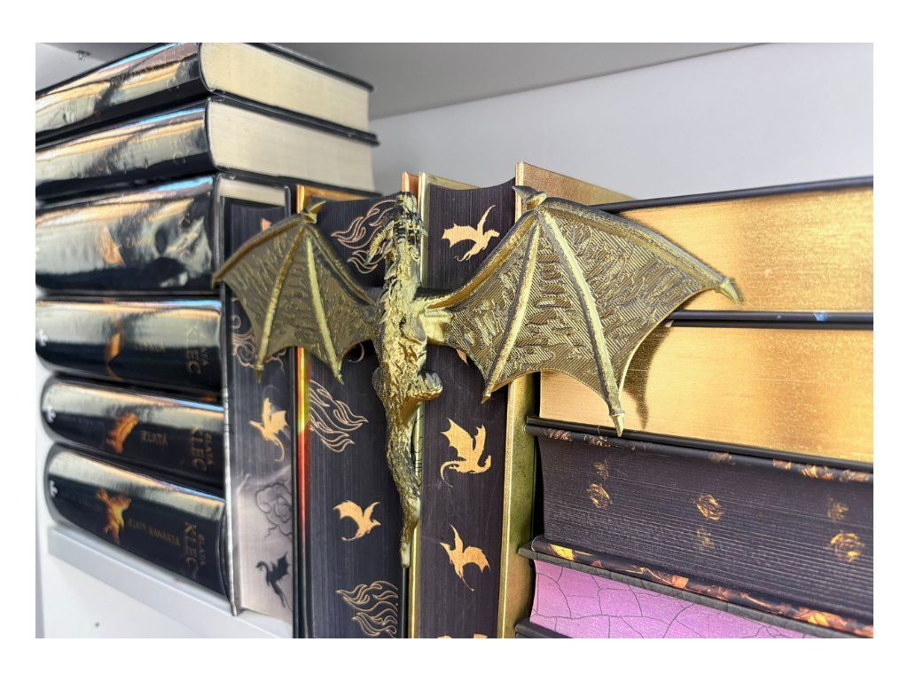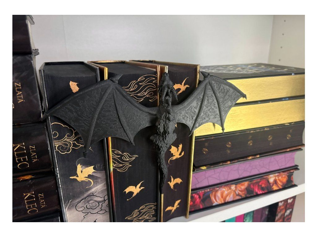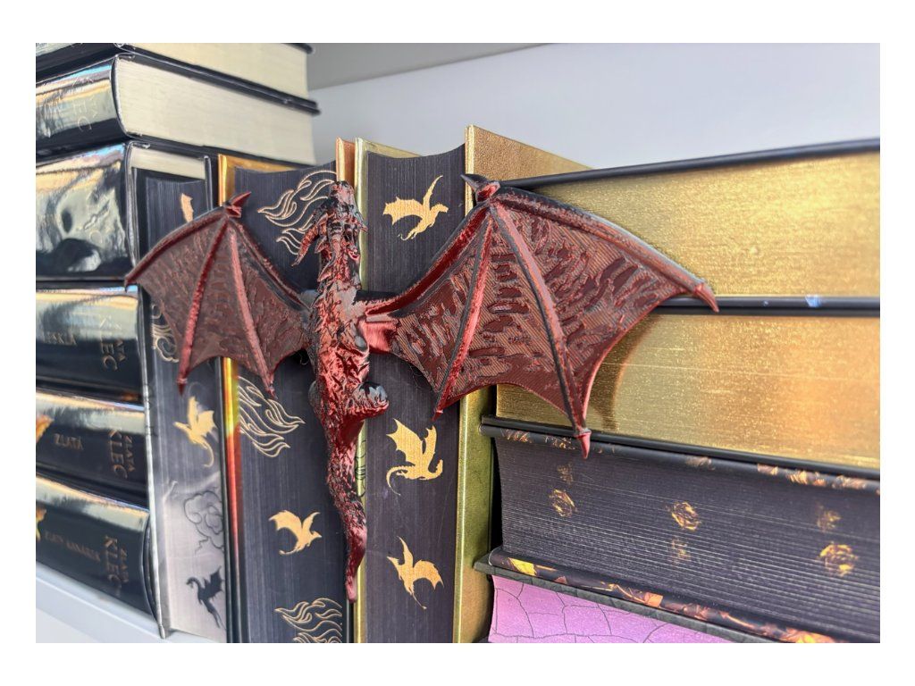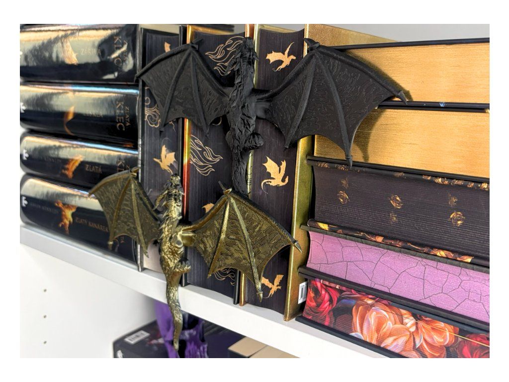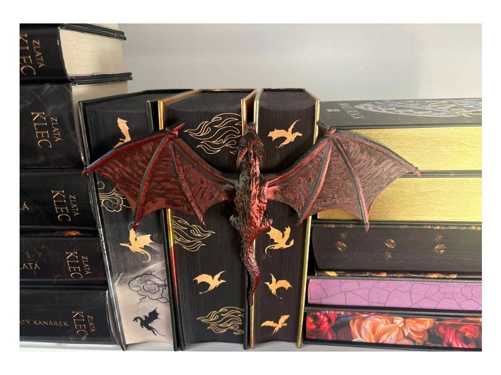 Mezi hřbety knih se drží drak, který jako by právě přiletěl z jiného světa. Rozpjatá křídla, šupiny zachytávající světlo a pohled strážce, který bdí nad každým příběhem tvé knihovny. Tento dračí insert promění obyčejnou polici v kousek fantasy světa. Vypadá, jako by se drak právě protáhl mezi knihami a rozhodl se zůstat – chránit příběhy, poklady a světy ukryté mezi stránkami.